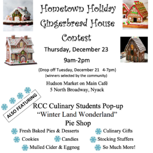 The Thanksgiving Pop Up Pie Shop at Hudson Market on Main was a huge success! So, the Rockland Community College Hospitality & Culinary Arts Center's Hudson Market on Main Cafe has decided to do another holiday pop-up pie shop. This pop-up will not only offer freshly baked pies, cookies and desserts, there will also be candies, culinary gifts, … [Read more...] about Holiday Gingerbread House Contest and Pop Up Pie Shop December 23rd