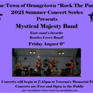 The Town of Orangetown "Rock the Park" 2021 Summer Concert Series presents Mystical Majesty Band, a Beatles cover band, on Friday, August 6th at Veterans Memorial Park. … [Read more...] about “Rock the Park” 2021 Summer Concert Series presents Mystical Majesty Band August 6th