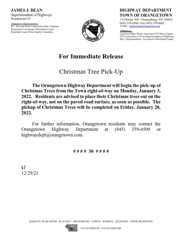 Free Christmas tree pickup in Orangetown December 31, 2021 Free Christmas tree pickup will begin in the Town of Orangetown on Monday, January 3rd.