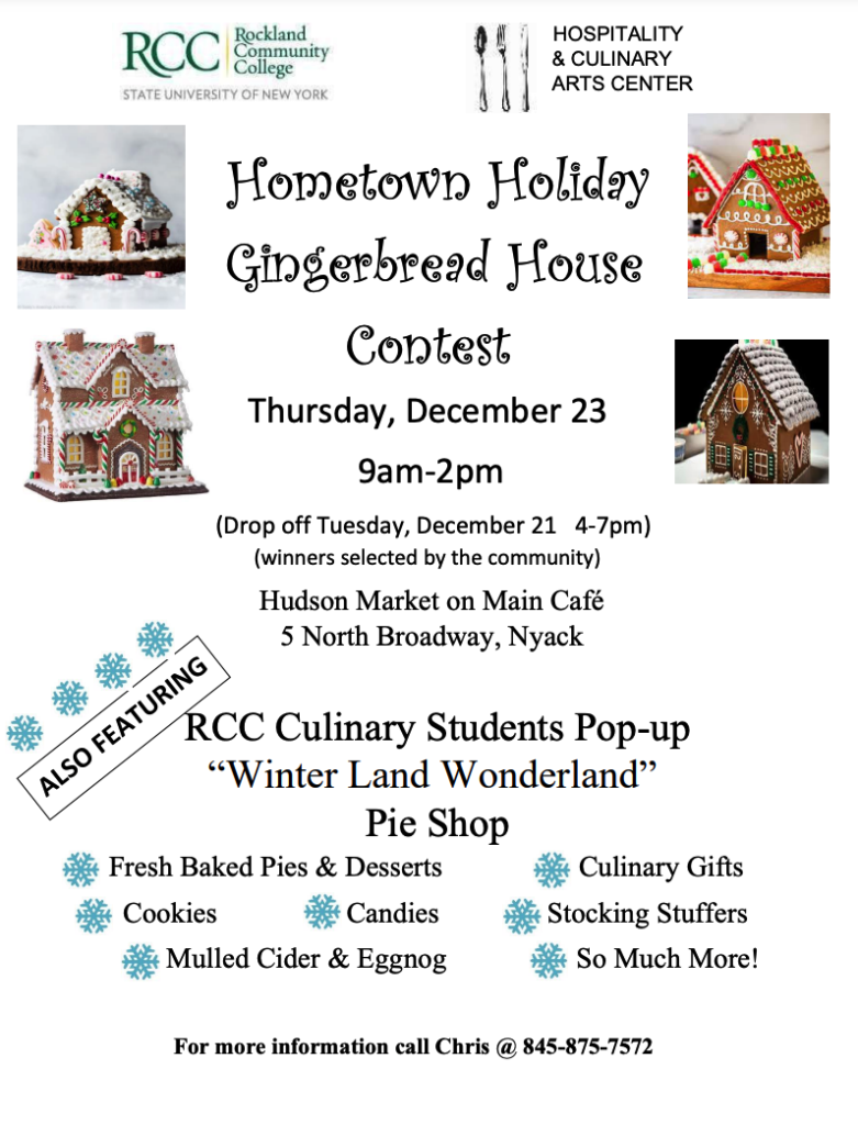 The Thanksgiving Pop Up Pie Shop at Hudson Market on Main was a huge success! So, the Rockland Community College Hospitality & Culinary Arts Center’s Hudson Market on Main Cafe has decided to do another holiday pop-up pie shop. This pop-up will not only offer freshly baked pies, cookies and desserts, there will also be candies, culinary gifts, stocking stuffers, mulled cider and egg nog. All orders must be placed by Friday, December 17 to be guaranteed.