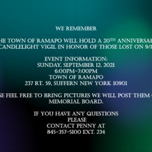 The Town of Ramapo will host a candlelight vigil in honor of those lost on 9/11 on Sunday, September 12th from 6 to 7pm at Ramapo Town Hall. … [Read more...] about Ramapo to host 9/11 vigil on September 12th